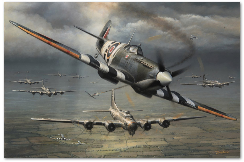 | This powerful piece from master aviation artist John D. Shaw features legendary Wing Leader “Johnnie” Johnson, the highest scoring RAF Ace of WWII, leading the Spitfires of No. 144 (Canadian) Wing during the weeks following D-Day. Having picked up a formation of USAAF B-17s on a bombing mission to Germany, the Canadian Wing’s Spitfire Mk IXs stay with the American bombers to fend off attacks from prowling Luftwaffe fighters. |