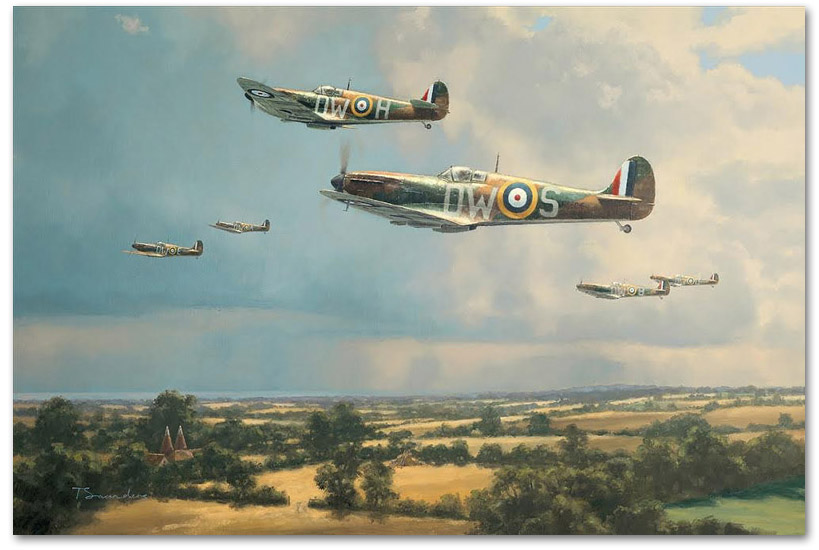 Following the fall of France in June 1940 Britain stood alone, seemingly on the brink of defeat. With the German Army, battle- hardened and flushed with recent success, massing in the Pas-de-Calais the British waited for the invasion that must surely come. Only one thing stood in their way – the English Channel. Before any invasion could take place the Luftwaffe must destroy an already battered RAF Fighter Command in south-east England and Goering boasted that his men could deliver the necessary coup- de-grâce ‘within days’. However, neither he nor Hitler had reckoned on the resilience, skill and determination of the RAF’s desperately small but gallant band of fighter pilots. For the next three and a half months the battle raged; first as the Luftwaffe tried to lure Fighter Command into the big aerial battle that Goering wanted through provocative assaults on coastal shipping, ports, radar stations and Fighter Command airfields and then, as the RAF refused to be drawn, Goering switched his attention to the daylight bombing of London in an attempt to break British morale. His new plans took a few days to prepare but that was all the weakened British needed. Within a week growing numbers of replacement pilots and machines had arrived with the front-line squadrons and Fighter Command was back to full strength and the Luftwaffe was in for a battering. With increasingly large losses of men and machines, German morale fell and any thoughts of victory, let alone invasion, were over. Fighter Command had repelled the enemy and, for the first time in the war, the Germans had badly misjudged their opponents. Anthony’s atmospheric painting depicts a definitive moment in late August 1940 as the Mk.I Spitfires of 610 Squadron, one of the units to bear the full brunt of the Luftwaffe’s attacks, scramble away from their base at Biggin Hill towards the Channel where yet another incoming |