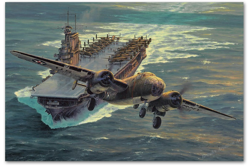 The daylight raid on Tokyo, led by Lt Col James H. Doolittle on Sunday 18 April 1942, has rightfully entered the history books as one of the most daring and courageous operations of the Second World War. On that day, in mid ocean, Doolittle had launched his B-25 Mitchell bomber from the heaving, spray-soaked flight deck of an aircraft carrier, a deck too short to land on, and flown on to bomb Tokyo. He knew there would be no return to the USS Hornet, either for him or the 15 heavily- laden B-25s behind him, for this was a feat never before attempted, and for every crew member the mission was a one-way ticket. Yet, under the leadership of Jimmy Doolittle, The mission for the 16 bombers was to bomb industrial targets in Tokyo and surrounding areas, to slow production of strategic war material, then fly on to land in the part of south-west China that was still in the hands of friendly Nationalist forces. All being well, the mission would be so unexpected it would plant the first seeds of doubt into enemy minds. It worked – the Japanese were forced to quickly divert hundreds of aircraft, men and equipment away from offensive operations to the defence of their homeland. There was, however, another reason behind the Doolittle’s raid – to lift the morale of an American public devastated by the attack on Pearl Harbor four months earlier. And the success of the mission provided the boost that was needed. If any had doubted America’s resolve in the face of uncertainty, the courage, determination and heroism displayed by Lt Col Doolittle and his band of aviators restored their determination. Although it might take years, and the price would be high, America and her allies understood that the fight could, and would, be won. Specially commissioned to commemorate the 75th Anniversary of the Doolittle Tokyo Raid in support of the James H. Doolittle Education Fund, Anthony’s inspirational painting portrays the dramatic moment that Lt Col Jimmy Doolittle lifts his B-25 off the pitching deck of the USS Hornet. Having timed his launch to perfection he climbs steeply away, ready to adjust his compass bearing for a direct line to Tokyo. On the sodden deck behind him the crews of the remaining 15 aircraft, whose engines are warmed, ready and turning, will quickly follow their commanding officer into the murky sky. |